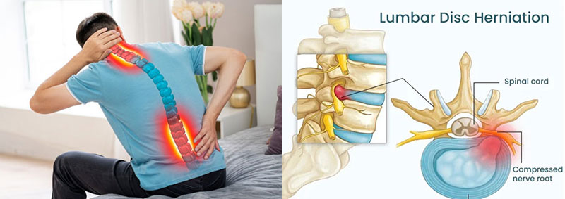 - Lumbar Disc Prolapse: Lower back pain, radiating pain into the buttocks or legs (sciatica), numbness or tingling in the legs or feet, weakness in the legs.